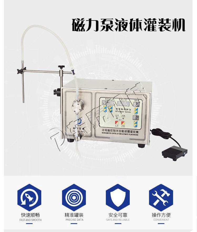 醫(yī)用小型液體灌裝機(jī)又叫小型磁力泵灌裝機(jī)可灌充絕大類型的液體,包括高粘稠度的液體。醫(yī)用小型液體灌裝機(jī)是利用位電腦對微型水泵在灌裝時(shí)間、電機(jī)轉(zhuǎn)速等因素上的控制,達(dá)到均勻的、重復(fù)誤差極小的液體灌裝方式,廣泛的應(yīng)用于藥物、化工、食品、飲料、油脂、化妝品等行業(yè),適用于低粘度、無顆粒的液體分裝、小批量生產(chǎn)。