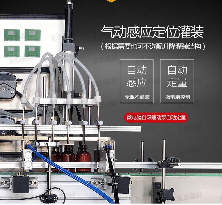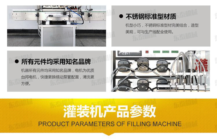 1、消毒水液體灌裝旋蓋線所有元件均采用,電機為優(yōu)質臺邦電機,快捷更換蠕動泵管配置,清洗更方便。機身為鋁合金+不銹鋼。本機操作簡單、直觀方便,自動感應,無瓶不灌裝,灌裝和旋蓋部分過渡,可獨立使用灌裝機或者旋蓋機部分,另旋蓋機標配自動分瓶功能,方便小瓶旋蓋,性能穩(wěn)定,可靠,效率高。