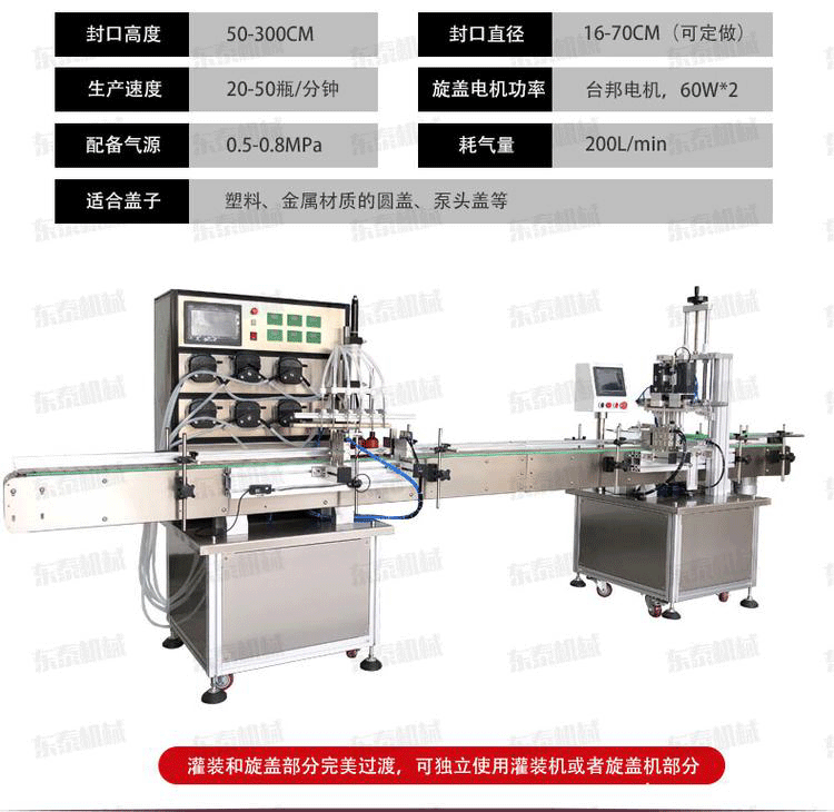 1、消毒水液體灌裝旋蓋線所有元件均采用,電機為優(yōu)質臺邦電機,快捷更換蠕動泵管配置,清洗更方便。機身為鋁合金+不銹鋼。本機操作簡單、直觀方便,自動感應,無瓶不灌裝,灌裝和旋蓋部分過渡,可獨立使用灌裝機或者旋蓋機部分,另旋蓋機標配自動分瓶功能,方便小瓶旋蓋,性能穩(wěn)定,可靠,效率高。